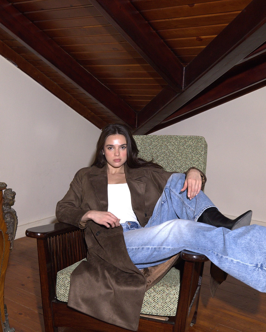 Elegant and timeless — this full-length suede coat features a soft inner lining and a sleek belt for a flattering, cinched silhouette.